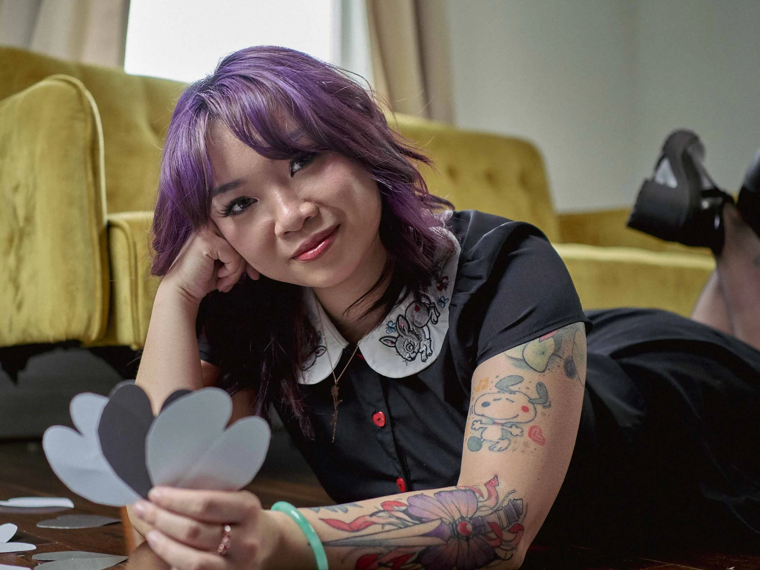 A young woman with purple hair lying on her side on the floor, resting her head on her hand, and holding paper heart shapes while smiling at the camera. She has tattoos on her arm and is wearing a black dress with a white collar featuring a cartoon r View fullsize