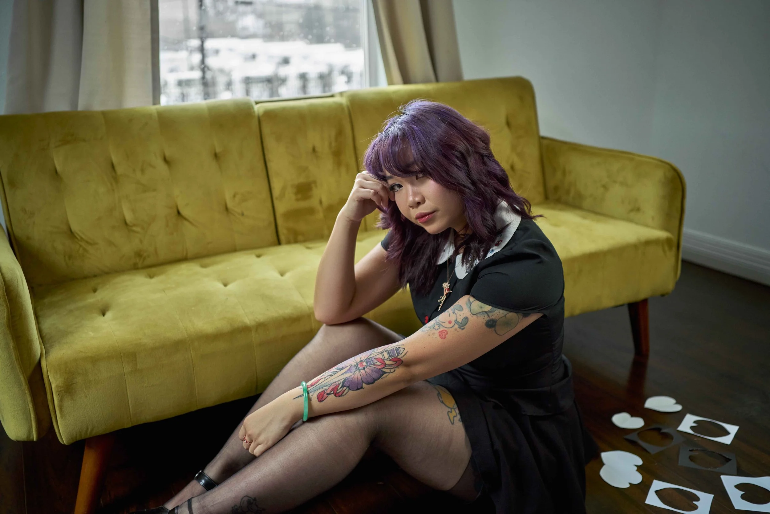 A woman with purple hair and tattoos sitting on the floor next to a yellow sofa in a room with a large window. She wears a black dress with a white collar, black tights, and black shoes, and appears to be pensive, resting her head on her hand, with p