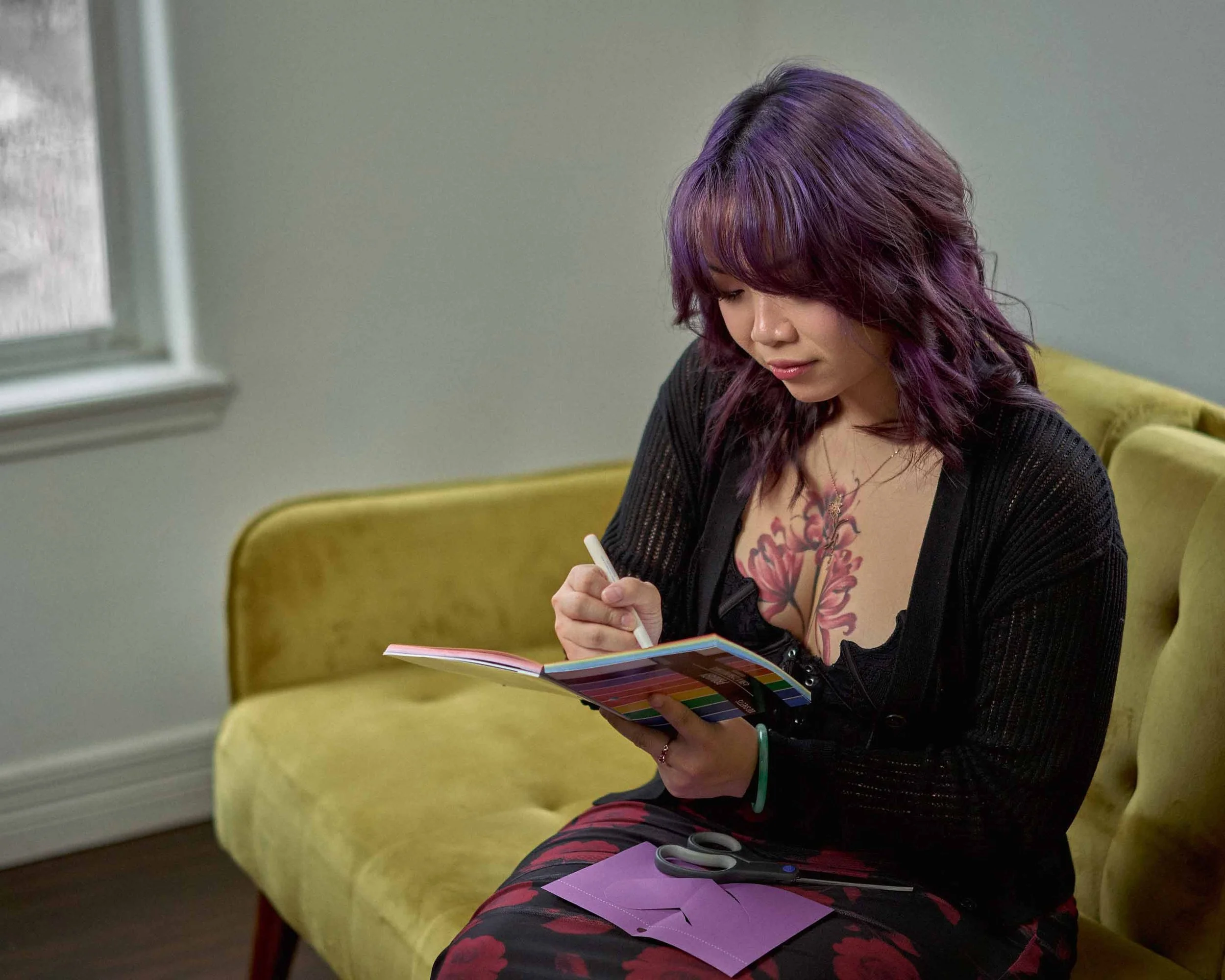 A woman with purple hair and tattoos on her chest sitting on a yellow couch, working on a color swatch book, with scissors and purple paper on her lap. View fullsize