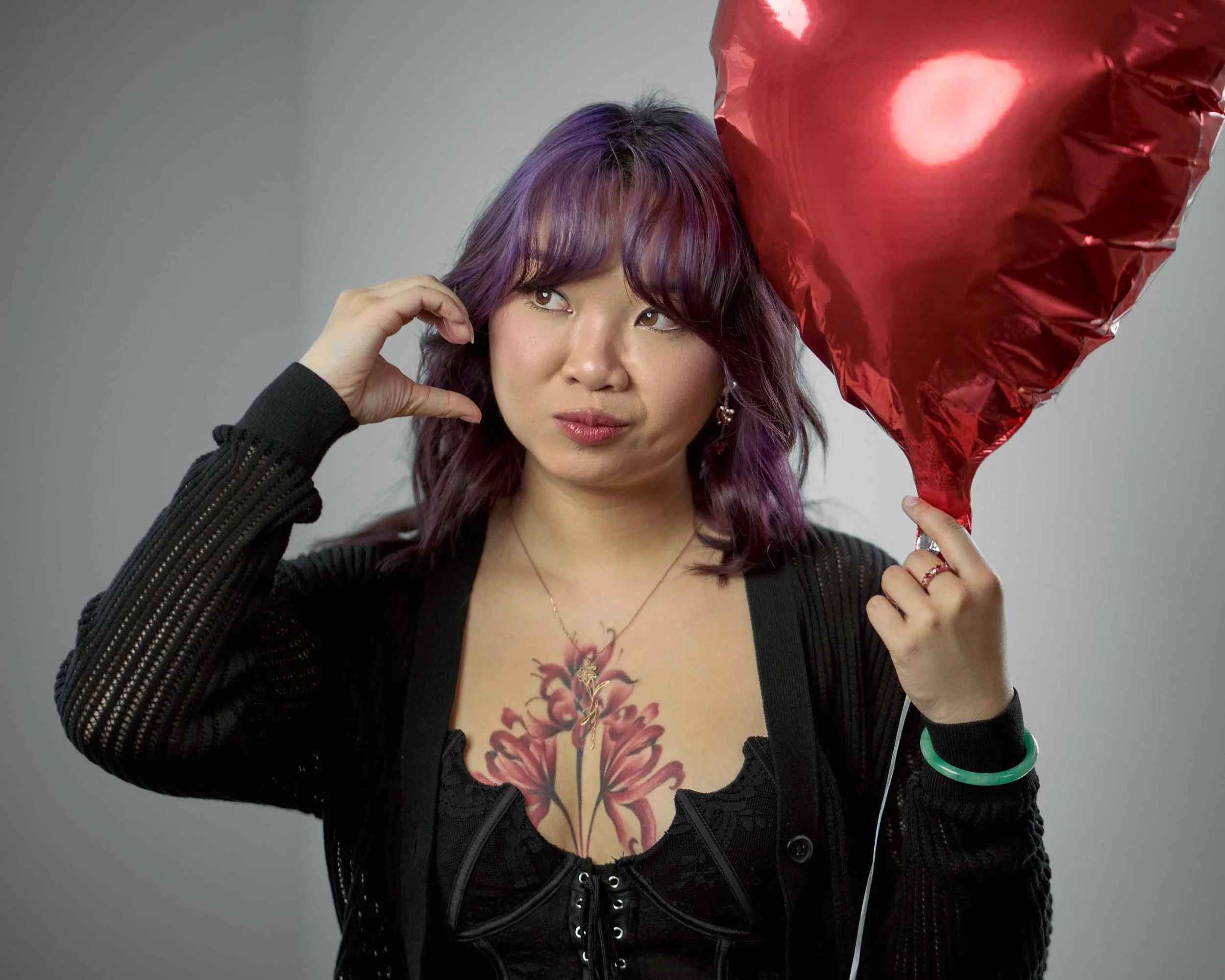 A woman with purple hair holding a red heart-shaped balloon, touching her ear with her left hand, wearing a black lace top and a black jacket, with a floral tattoo on her chest. View fullsize