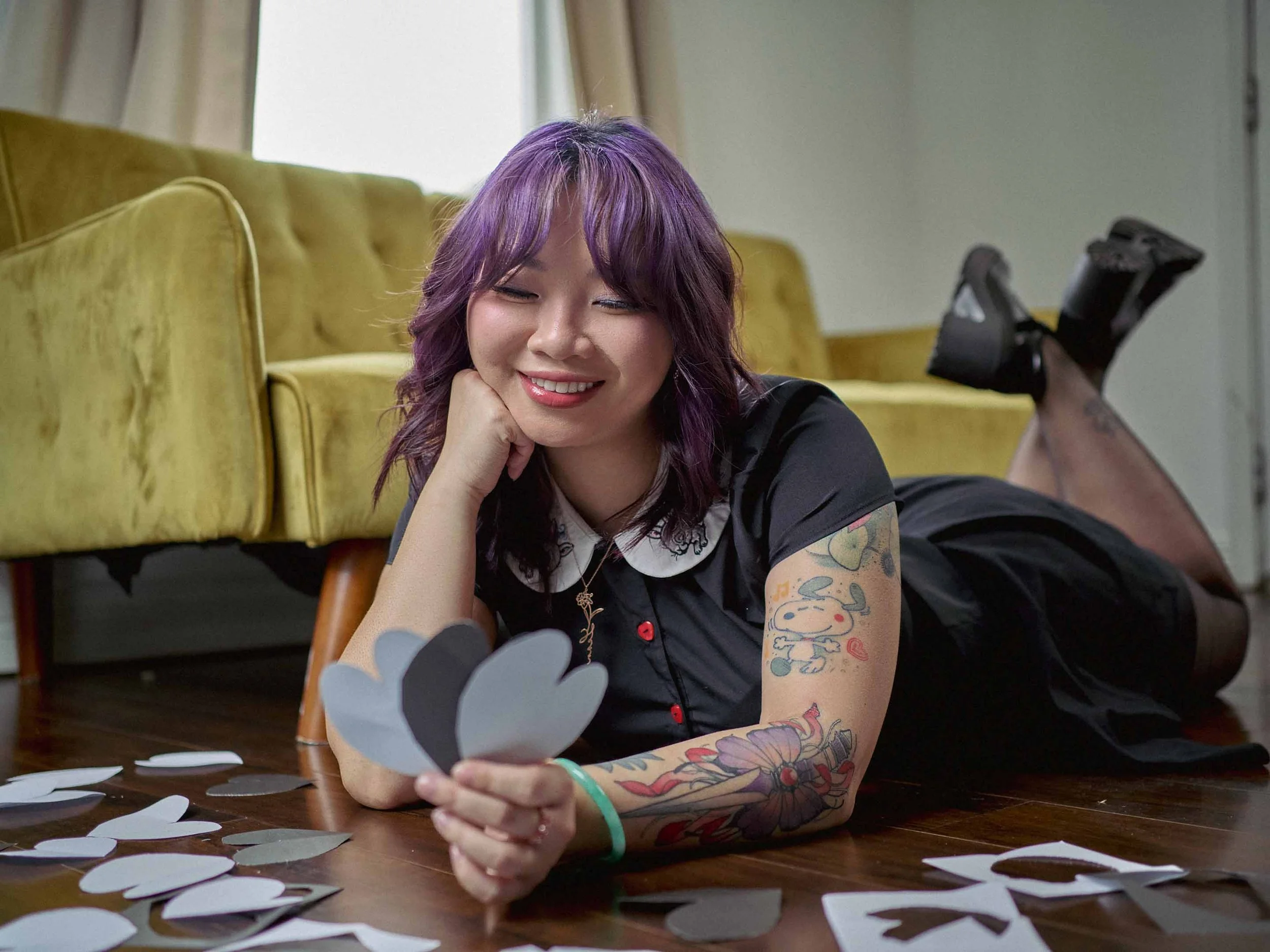 A woman with purple hair and tattoos lying on her stomach on the floor, holding a bunch of paper hearts, inside a room with a yellow couch in the background. View fullsize